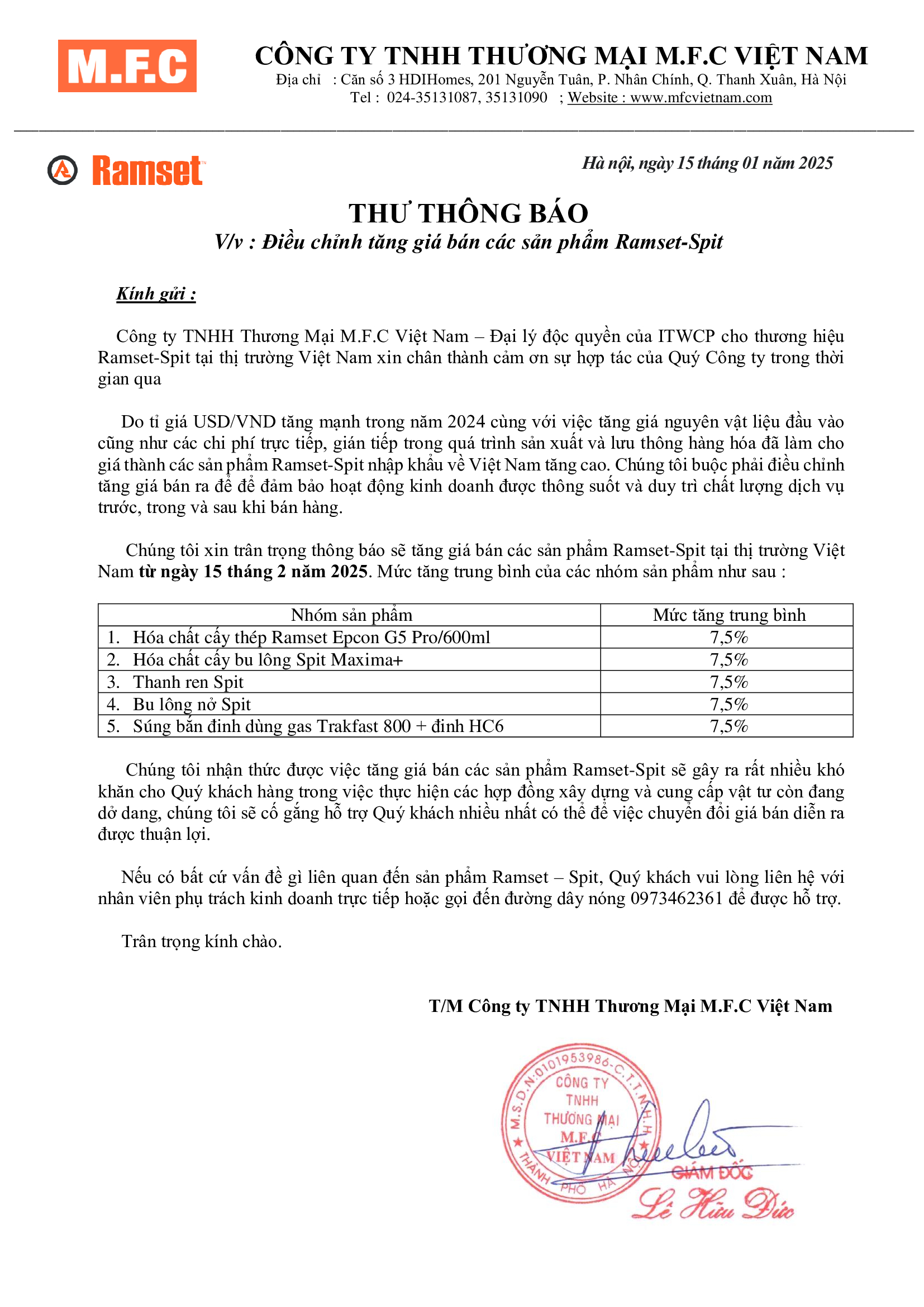 Thông báo điều chỉnh giá bán sản phẩm Ramset - Spit năm 2025